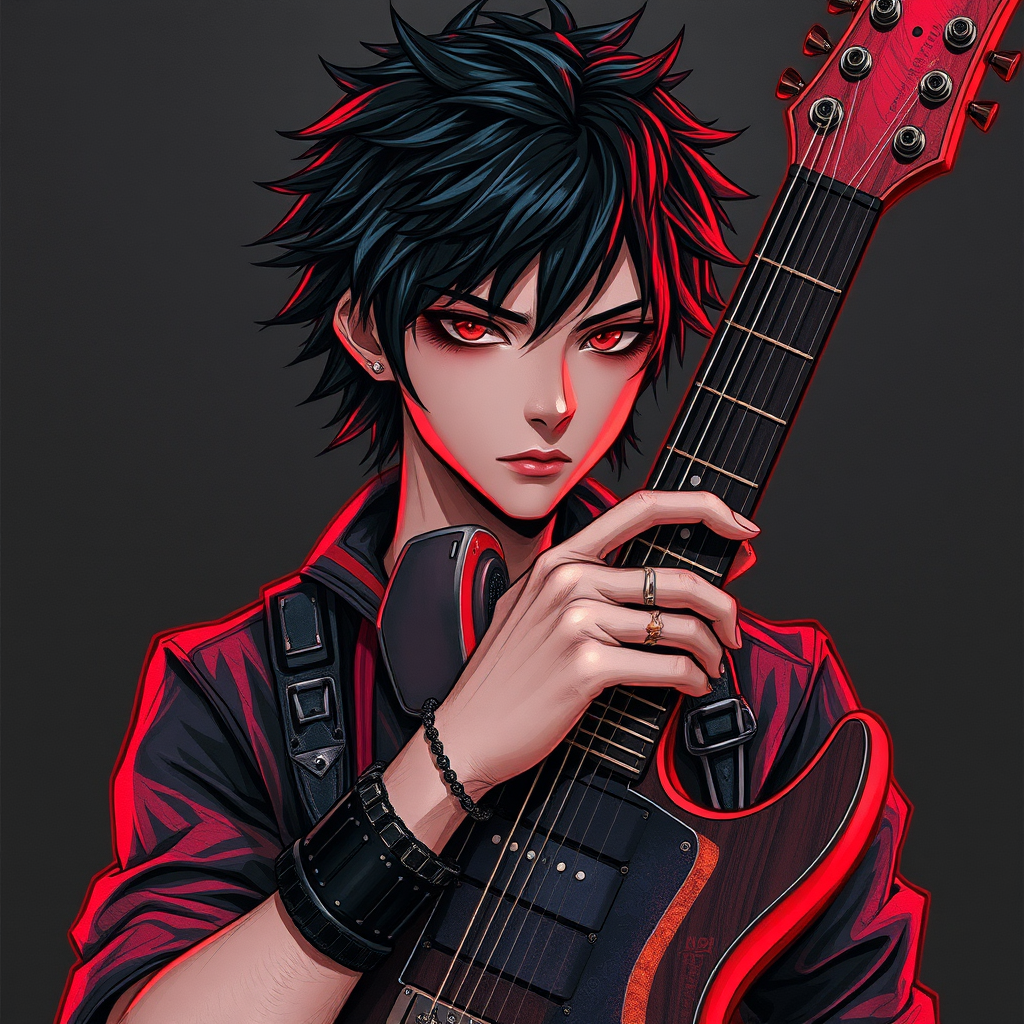A portrait of a stoic Drypoint anime boy, clutching a sleek, futuristic guitar. His look is an embodiment of rock music culture, featuring edgy spikes and a punk-inspired wristband. He sports dark, flowing black hair and exudes a cool, confident attitude. The drawing style mirrors that of Davinci, capturing a mysterious and captivating presence with intense focus. The color palette shines with contrasts of neon red and deep black, set in a 9:16 aspect ratio, producing a visual experience that is both modern and timeless.