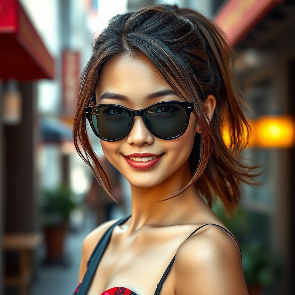 A portrait of a stunning Southeast Asian girl with medium-length brown hair, styled in a ponytail. She's facing the viewer with a friendly expression, her face highly detailed in the style of Greg Rutkowski and Magali Villeneuve, featuring perfect proportions and captivating eyes. She wears chic black sunglasses and a red and black floral mini dress that complements her toned physique. The scene is captured in high detail, with a full-length frame that exudes colorful, sharp-focused hyperrealism, reminiscent of an epic movie poster. The vibrant art showcases intricate details and cinematic lighting, capturing the essence of a masterpiece in photography.