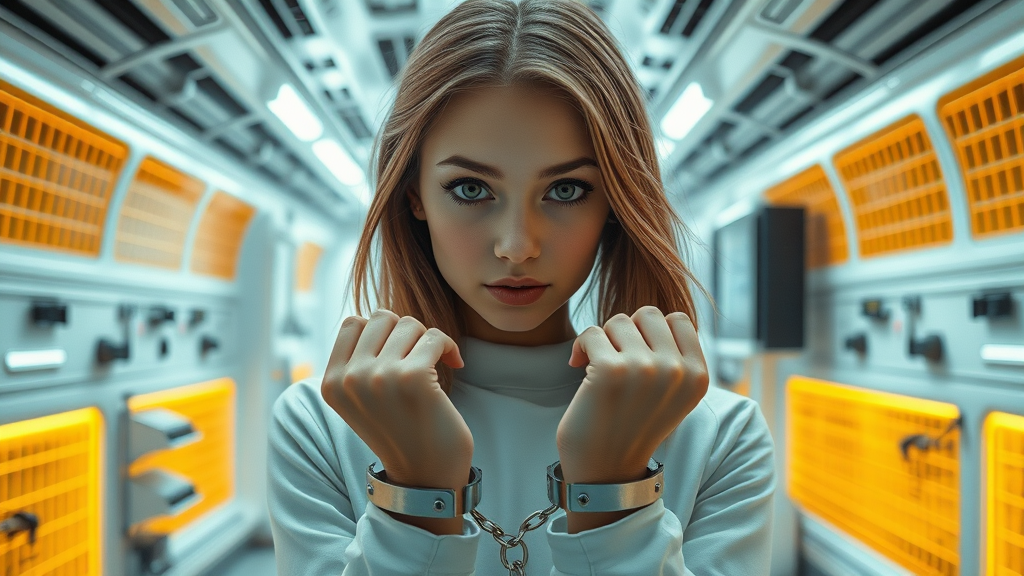 A portrait of a stunningly beautiful, slender girl with a naive and innocent expression, striking a captivating pose in a sci-fi setting. The girl's hands are cuffed, and she looks directly at the camera, set against the backdrop of a futuristic, white sci-fi lab with mustard-colored grids and high-tech equipment. Her hair is a unique shade, adding to the scene's vibrancy. The image is in ultra-high resolution, photorealistic, with hyperrealistic details and exquisite lighting reminiscent of Rembrandt. The overall quality is stunning, capturing a blend of intrigue and elegance in a perfect 8k resolution. The scene is free from any imperfections, maintaining natural proportions without distortion or artificial modifications, ensuring a seamless visual experience.