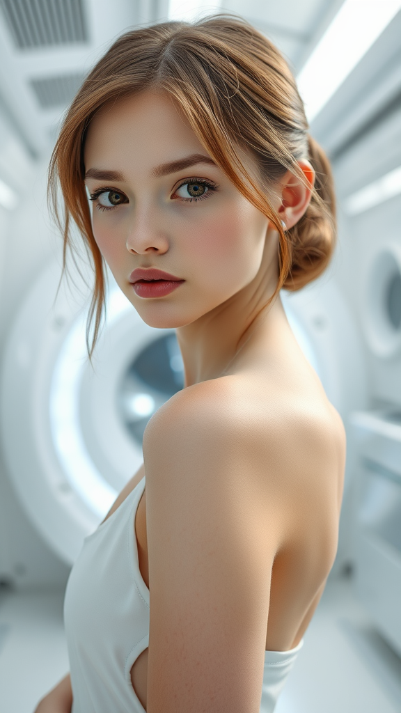A portrait of a stunningly beautiful slender girl with a naive and innocent expression, featuring captivating hair color and an elegant pose. She stands in front of a sleek, futuristic sci-fi white lab, with a reablation capsule in the background. The scene is captured in ultra-high resolution, with hyper-realistic details and Rembrandt lighting. The girl gazes directly into the camera, with the setting emphasizing futuristic technology and a mesmerizing quality. The atmosphere evokes a sense of innovation and allure, carefully avoiding any defects or distortions.