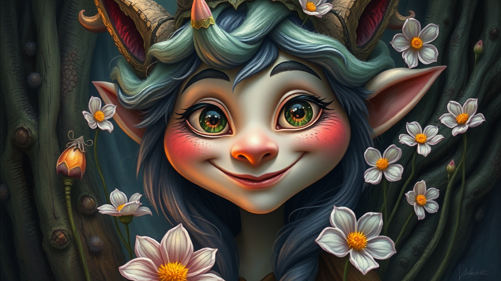 A portrait of a whimsical folklore character, perhaps a mischievous forest sprite with twinkling eyes and an impish grin. The style echoes the enchanting art of John Bauer, featuring elaborate details and a lush, vibrant color palette. Soft, diffused lighting casts a gentle glow over the scene, imparting a magical, otherworldly atmosphere. The character is surrounded by delicate, intricate elements of the forest, such as ethereal flowers and intricately textured tree bark, creating a tapestry of natural beauty.