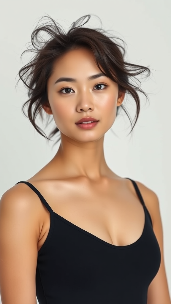 A portrait of a woman wearing a leotard with tousled hair against a plain white backdrop. Embrace simplicity and focus on the natural expression of the Asian woman, ensuring clarity and elegance. The composition should avoid any elements that distract from her authentic beauty. Keep the background clear, emphasizing the subject's poise and presence without any additional elements or visual distortions. Aim for a clean and minimalistic aesthetic.