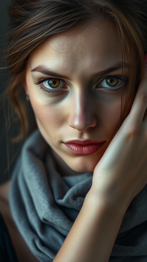 A portrait of a woman with expressive brown eyes, capturing the essence of a person in the style of Yigal Ozeri. Infused with hues of light navy and soft gray reminiscent of Patrick Demarchelier’s classic photography. The subtle intricacies of joints and connections are emphasized, reflecting a sensation of unity and movement. The scene is illuminated with Caravaggist-inspired studio lighting, offering dramatic contrasts and depth. The work features an impressionistic touch, balancing realism and artistic flair.