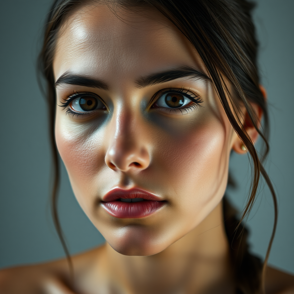 A portrait of a woman with expressive brown eyes, captured in the detailed realism style of Yigal Ozeri, featuring a color palette of light navy and soft gray, reminiscent of Patrick Demarchelier's photography. Inspired by Alayna Lemmer's focus on anatomical connections, emphasizing the interplay of joints and subtle movements, with dramatic, high-contrast studio lighting that evokes Caravaggism. The composition is elongated, suggesting a 1:2 aspect ratio, with a heightened sense of artistic stylization.