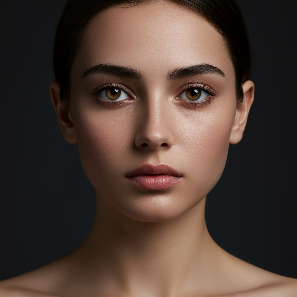 A portrait of a woman with expressive brown eyes, captured in the style of Yigal Ozeri, her features highlighted with a palette of soft navy and gentle gray tones. The composition embraces the refined elegance characteristic of Patrick Demarchelier, while also infusing the detailed focus on joints and connections inspired by Alayna Lemmer. The image draws from Caravaggism, employing dramatic studio lighting to create depth and contrast, presenting a harmonious blend of realism and artistry.