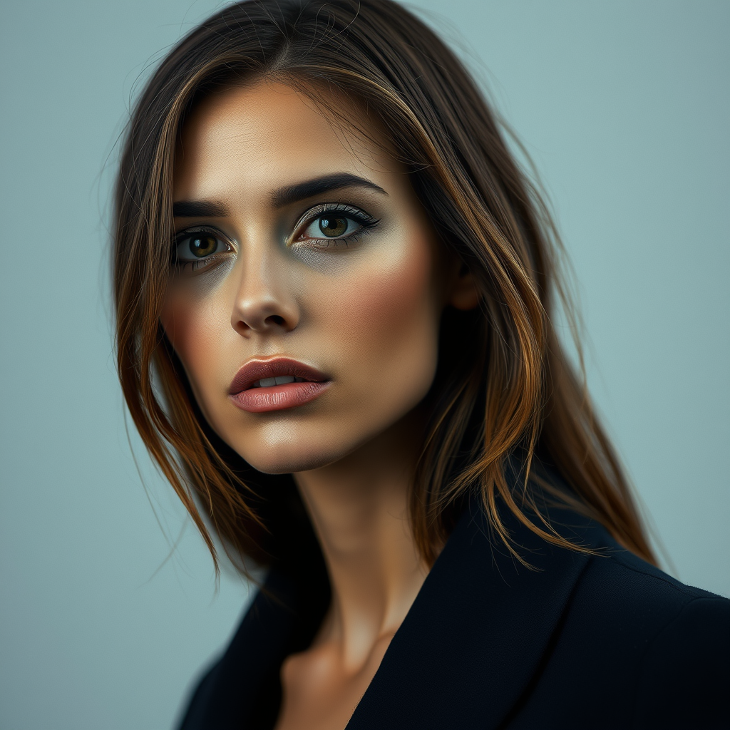 A portrait of a woman with intense brown eyes, blending the hyper-realistic style of Yigal Ozeri with the elegant touch of Patrick Demarchelier, featuring soft light navy and light gray tones. Alayna Lemmer's focus on detail highlights the connections and joints, evoking the dramatic contrasts of Caravaggism. Studio lighting creates a striking interplay of shadows and highlights, enhancing the depth and realism in a 1:2 aspect ratio, while maintaining a sophisticated artistic stylization.