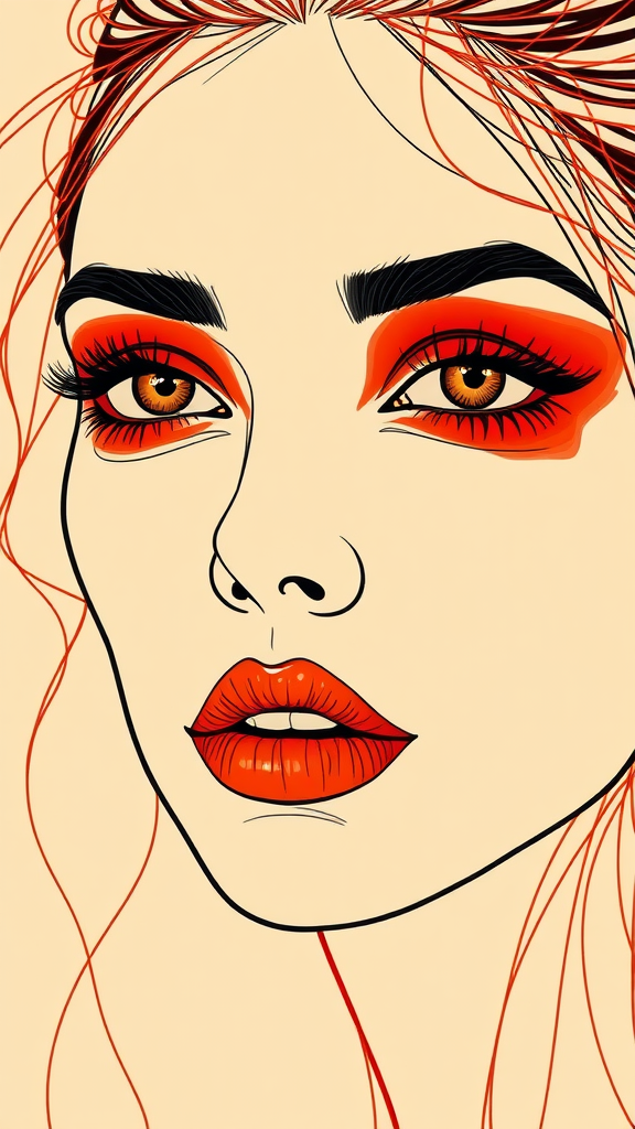 A portrait of a woman's face featuring striking red eyeshadow, crafted in bold and vivid lines of dark beige and orange, resembling a wire sculpture. The line work is impeccable, capturing a captivating and edgy essence, with raw yet refined details. The portrait exudes a sense of both modern art and timeless beauty.