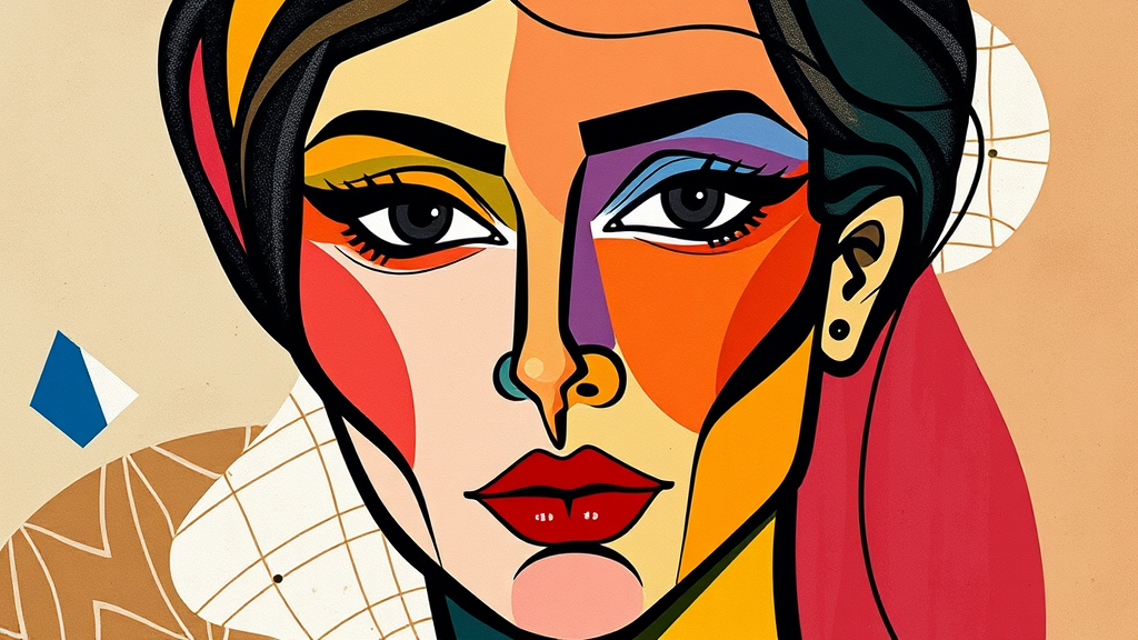 A portrait of a woman's face inspired by Picasso's cubism style, featuring bold and geometric shapes, vivid and contrasting colors, and fluid lines, maintaining a harmonious yet fragmented composition with a touch of modern flair and dynamic expression.