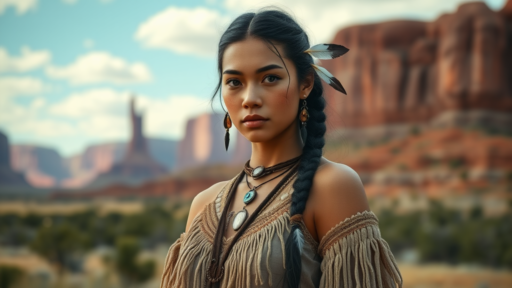 A portrait of a young, beautiful Native American woman inspired by Madison Beer as Pocahontas. She has a perfectly symmetrical face adorned with feather jewelry and is wearing a traditional, handmade dress. As a strong female hunter and warrior, she stands confidently in a majestic Utah landscape. The scene is rendered in ultra-realistic concept art style, capturing elegance and depth. The image focuses sharply on her presence and the environment surrounding her, avoiding any distortions or imperfections found in lower quality images.
