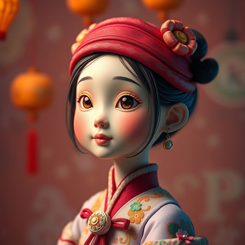 A portrait of a young Chinese girl crafted in an unreal engine 5 aesthetic combined with Disney animation charm, capturing the essence of adorable toy sculptures. Influences from Charles Willson Peale's detailed realism, Jeremiah Ketner's whimsical style, and Mark Ryden's surreal whimsy are evident. The piece embraces an aurorapunk theme, blending vibrant colors and ethereal light, creating a fantastical, dreamlike atmosphere. The composition is tall and slender, evoking a sense of elongated elegance, with a strong sense of artistic stylization and imaginative flair.