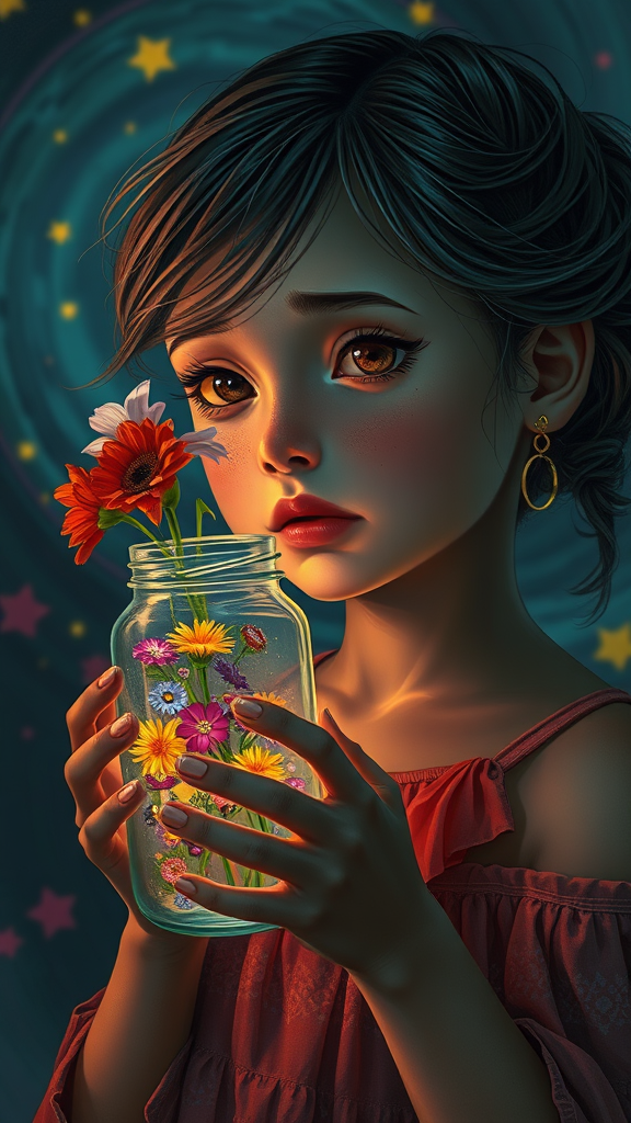 A portrait of a young girl holding a jar filled with vibrant flowers, set in a detailed dreamscape style. The scene is illuminated with glowing colors and features multidimensional shading, evoking a mysterious nocturnal atmosphere. The girl has earrings made of delicate wires, and her face has an intriguing, lived-in appearance. Her expression is one of wonder and curiosity as she gazes at the flowers. The background is a swirling tapestry of glowing hues, giving a sense of depth and movement. The setting feels both surreal and storybook-like, inviting viewers into a world of imagination and dreams.