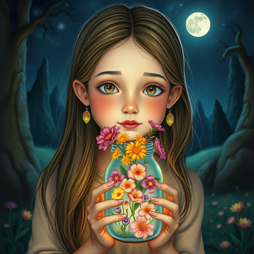 A portrait of a young girl holding a jar filled with vibrant, enchanting flowers, set against a backdrop of a mysterious nocturnal landscape. The scene is illustrated in the style of detailed dreamscapes and storybook illustrations, featuring glowing colors and multidimensional shading. The girl's face, slightly smudged with dirt, is framed by her long hair adorned with ear rings that catch the moonlight. The atmosphere is magical and serene, with the flowers in the jar exuding an ethereal glow that illuminates her gentle expression. The artwork captures a sense of wonder and whimsy, as if plucked from a fairy tale, with carefully crafted details enhancing the depth and texture of the scene.