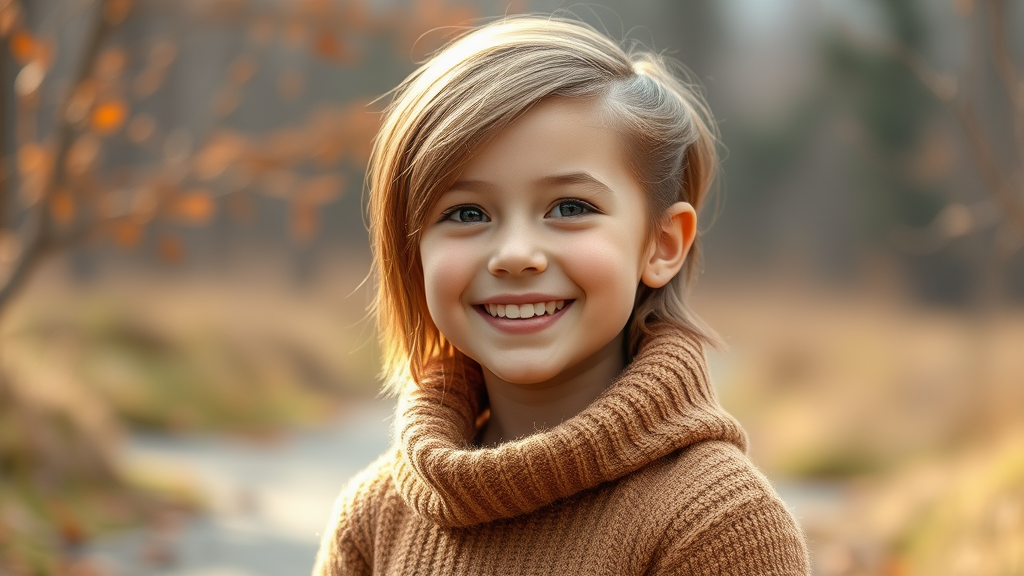 A portrait of a young, radiant girl with a captivating smile, sporting a chic asymmetrical haircut. She's dressed in a cozy autumn ensemble, standing amidst a serene outdoor landscape. Captured by a renowned photographer, the image features a minimalist aesthetic with a natural backdrop. Winner of a prestigious contest, it has been prominently showcased on CG Society.