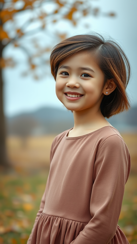 A portrait of a young, radiant girl with a joyful smile and a chic Asymmetrical Cut hairstyle, wearing an elegant fall dress. She is set against a serene outdoor backdrop, captured by a renowned photographer. The image is characterized by its Minimalist aesthetic, highlighting the girl's natural beauty amidst the subtle autumn scenery. This captivating photograph, celebrated for its artistic merit, earned recognition as a contest winner and has been prominently featured on CG Society.