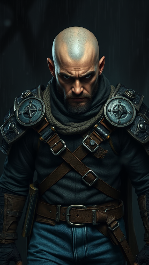 A portrait of a young ranger with a piercing gaze, clad in rugged armor. He is grizzled, bald, and exudes an aura of anger and determination. The scene is set in a shadowy forest, utilizing dark, muted colors that enhance the mood. He stands in a dynamic pose, emphasizing the detailed, realistic features of his face and hands. The environment is rich and cluttered with fantastic elements, depicted in an 8k resolution unity render that captures both action and atmosphere. The dim lighting casts heavy shadows, highlighting skin pores and facial markings. The setting includes heavy rain and floating particles, with dim and trim lighting that adds depth. His attire features an unexpected modern twist with blue jeans, subtly blending different eras. The overall aesthetic is reminiscent of art by Artgerm, WLOP, Ilya Kuvshinov, Greg Rutkowski, and Alphonse Mucha, blending digital painting with sharp focus illustration.
