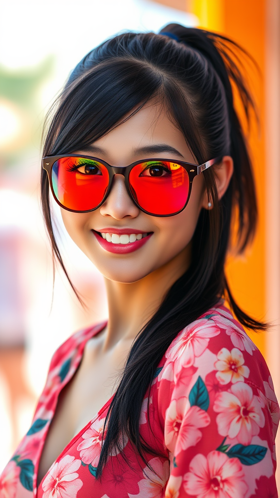 A portrait of a young Southeast Asian girl with medium-length black hair styled in a sleek ponytail, facing the viewer with a warm and friendly expression. Her highly detailed face shows influence from the styles of Greg Rutkowski and Magali Villanueve, accentuated by striking, beautiful eyes. She wears vibrant, colorful sunglasses, while her well-proportioned, toned body is elegantly dressed in a flowery blouse. Set against a bright, vividly lit background, the composition captures cinematic lighting in hyperrealistic photography with intricate details, embodying a true masterpiece. The aspect ratio emphasizes the portrait with a tall, elegant 9:16 frame.