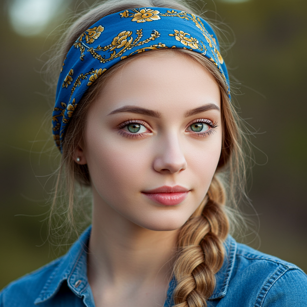 A portrait of a young woman exuding a serene expression and delicate features. Her dark blond hair cascades in a loose braid over one shoulder, adorned with a blue headband featuring intricate golden floral designs. Her complexion is clear and radiant, complemented by deep green eyes that reflect a gentle confidence. She dons casually sophisticated attire, with a relaxed chambray garment. The lighting is gentle and natural, accentuating the warmth and inviting essence of the portrait.