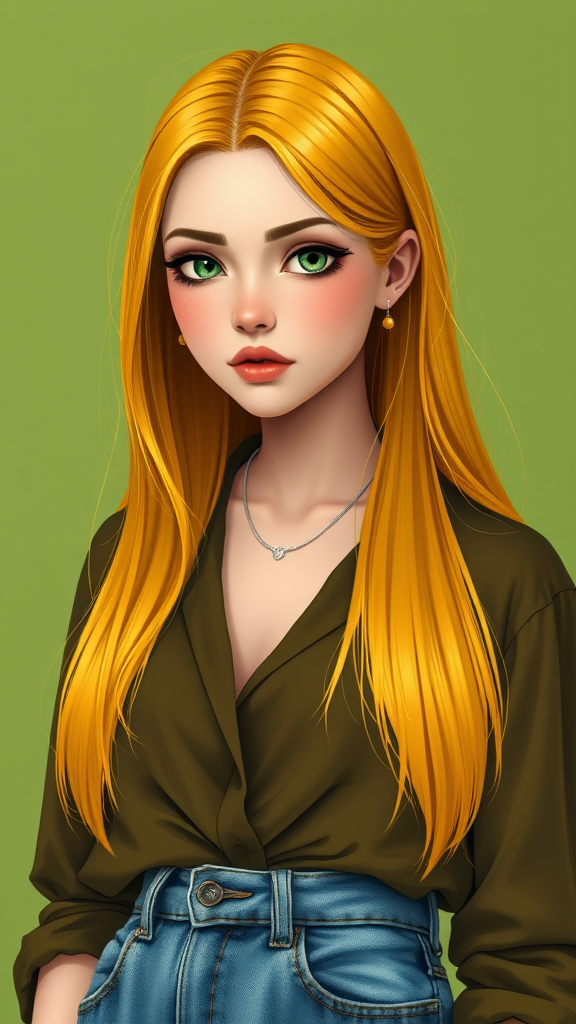 A portrait of a young woman featuring an upper body composition, styled as a character portrait in digital art and trending on Artstation. Her long, straight sunburst yellow hair contrasts beautifully with an almond green background. She wears a dark banana yellow shirt paired with simple jeans, and her dark emerald green eyes stand out. The artwork is highly detailed and rendered in 8k resolution. Her accessories include golden earrings and a silver simple necklace. She appears to be in her early twenties, with a matured look and a natural body shape. The scene conveys a subtle sense of embarrassment, yet remains tasteful and refined. This beautiful illustration avoids excessive elements and focuses on elegance and simplicity, ensuring the depiction maintains anatomical accuracy and a harmonious balance.