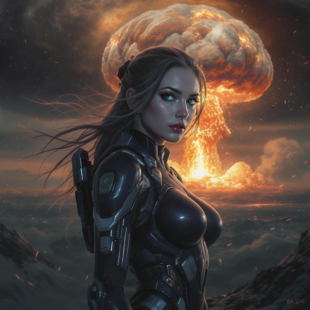 A portrait of a young woman in an advanced exo-suit, clad in sleek sci-fi armor, set against the backdrop of a colossal nuclear explosion. The scene captures the intense blast wave and drifting nuclear ash, with the iconic mushroom cloud looming ominously. Crafted with maximum detail, the image embodies a highly futuristic, science fiction aesthetic, rendered in stunning 8K UHD. The artwork is super detailed, achieving photorealism and hyper-realism with a sense of acceleration and speed. A brilliant flash of light illuminates the scene, captured with a painting-like quality. The third-person perspective enhances the cinematic feel, highlighting complex lighting and dynamic staging, with a long exposure effect that accentuates the drama of the moment.