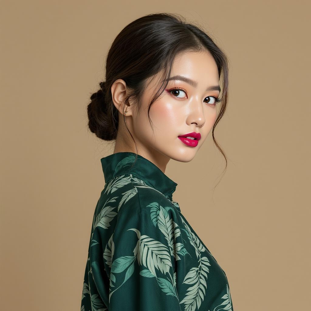 A portrait of a young woman radiating grace and modern sophistication. Her hair is styled in a chic low bun with gentle, wispy strands artfully accentuating her features. She dons an exquisite dark emerald batik blouse that highlights her fashion-forward elegance and composed poise. The portrait conveys a sense of timeless style and confident allure.