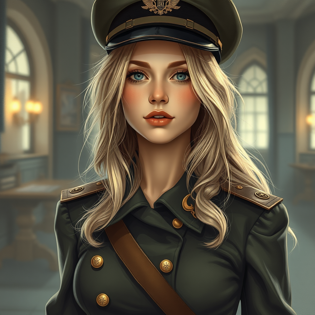 A portrait of a young woman wearing an officer's ceremonial tunic, her loose blonde hair cascading elegantly. The setting is an imaginative dieselpunk world reminiscent of Ian McQue's British Empire-inspired designs. The illustration features intricate and vintage details, exuding a retro charm with soothing tones and a hyper-detailed approach. The scene is bathed in soft cinematic light, incorporating dim colors, with an HDR feel and a slate gray atmosphere. While embracing a slightly faded look, this design steers clear of conventional beauty, aiming for an abstract representation. It plays with artistic elements like deformation and distortion, creating a surreal and slightly unsettling image, where limbs appear in unexpected places and forms, adding a unique twist to the depiction.