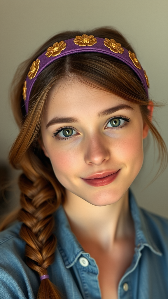 A portrait of a young woman with a calm expression and refined features. Her chestnut hair is gently styled into a loose braid cascading over her shoulder, and she dons a purple headband adorned with golden floral motifs. Her skin is clear and radiant, with soft green eyes that exude a gentle confidence. Her attire is effortlessly stylish, featuring a relaxed chambray shirt. The lighting is soft and ambient, enhancing the inviting warmth of the portrait.