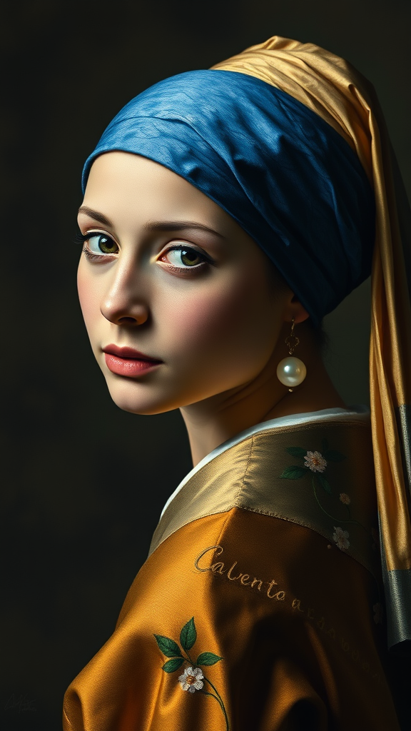 A portrait of a young woman with a serene expression, her head turned gently to the side, adorned with a shimmering pearl earring. The subject is captured in the style of the Dutch Golden Age, with soft, warm lighting that accentuates the smoothness of her skin and the delicate folds of her azure and gold headdress. The background is a rich, shadowed tapestry of deep greens and browns, lending an air of timeless elegance and mystery. Subtle floral patterns weave through her garment, adding a touch of nature-inspired beauty while maintaining the classic composition's understated grace.