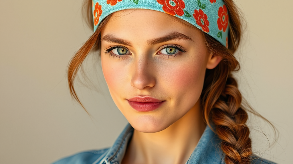 A portrait of a young woman with a tranquil expression and refined features. Her sun-kissed brown hair cascades in a loose braid resting over her shoulder, adorned with a sky blue headband featuring intricate orange floral designs. Her skin is radiant and smooth, while her eyes are a soft shade of pale green, exuding a quiet self-assuredness. She is dressed in chic, casual attire, wearing a comfortable denim shirt. The lighting is gentle and natural, accentuating the warmth and inviting essence of the portrait.