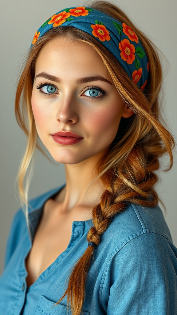A portrait of a young woman with a tranquil expression and refined features. Her light chestnut hair is styled in a loose braid cascading over her shoulder, complemented by a blue headband adorned with vibrant orange floral designs. She possesses radiant, smooth skin and gentle aqua blue eyes that exude a calm confidence. Her outfit is casually chic, featuring a comfortable blue chambray top. The lighting is gentle and natural, highlighting the warm and inviting essence of the portrait.