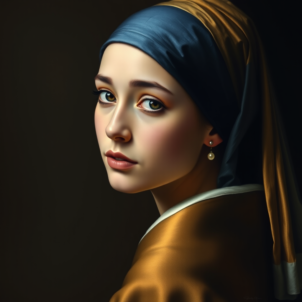 A portrait of a young woman with an ethereal presence, wearing a delicate pearl earring glinting softly against her slight shadow, set in a Dutch Golden Age style. Her serene gaze is turned slightly over her shoulder, framed by a deep navy and golden headscarf that drapes over her shoulder with subtle elegance. The background is a gently graduating dark-to-light backdrop, enhancing the timeless quality of her expression. Her skin is luminous, and the soft contours of her face are captured with masterful attention to light and texture, evoking a sense of mystery and grace.