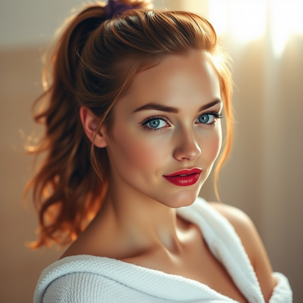 A portrait of a young woman with auburn hair elegantly tied in a loose high ponytail, her sparkling blue eyes framed by delicate lashes, and her lips accentuated with a subtle shade of crimson red lipstick. She wears a plush white towel draped over her shoulders, her skin radiant and luminous under the gentle embrace of natural lighting. The background is delicately blurred, evoking a peaceful and intimate ambiance, with hints of warm sunlight filtering through soft pastel hues.