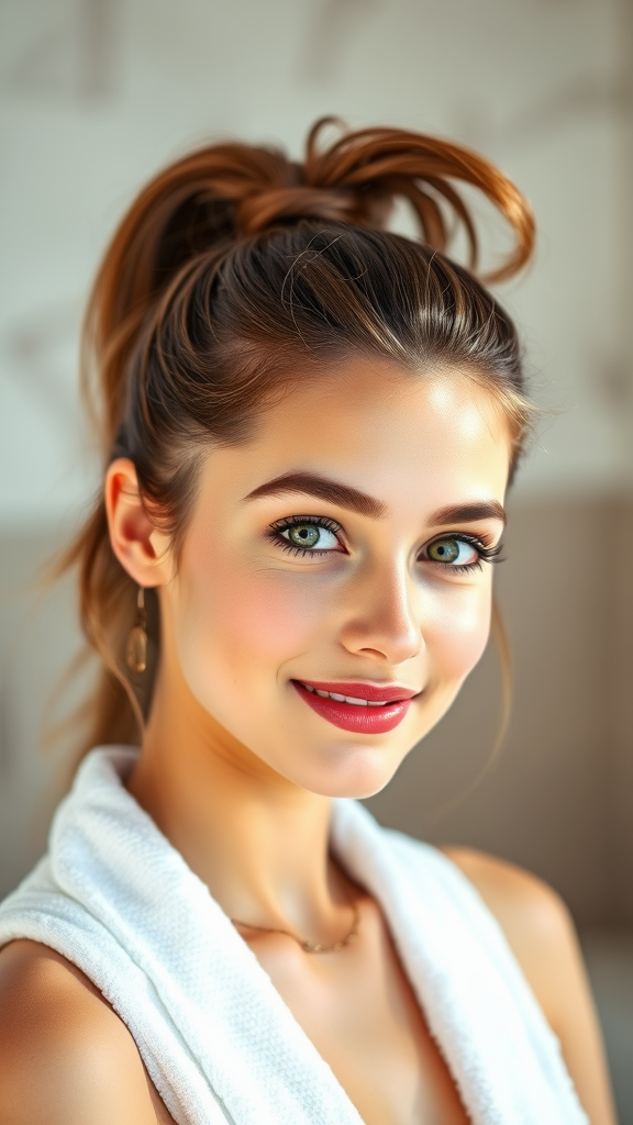 A portrait of a young woman with chestnut brown hair styled in a high ponytail, her expression gentle as she smiles softly. Her bright green eyes are highlighted by the subtle touch of coral pink lipstick. A white towel is elegantly draped over her shoulders, enhancing her radiant, glowing skin. Natural light bathes the scene, while the softly blurred background contributes to a tranquil and intimate atmosphere.