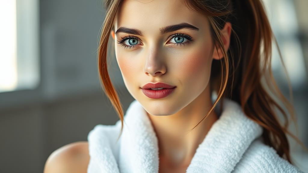 A portrait of a young woman with chestnut hair elegantly tied in a high ponytail, her lips painted a subtle shade of red that compliments her bright blue eyes. She is adorned with a plush white towel loosely draped over her shoulders, her skin radiating a healthy glow in the gentle natural light. The background is artistically blurred, enhancing the feeling of tranquility and intimacy in the scene.