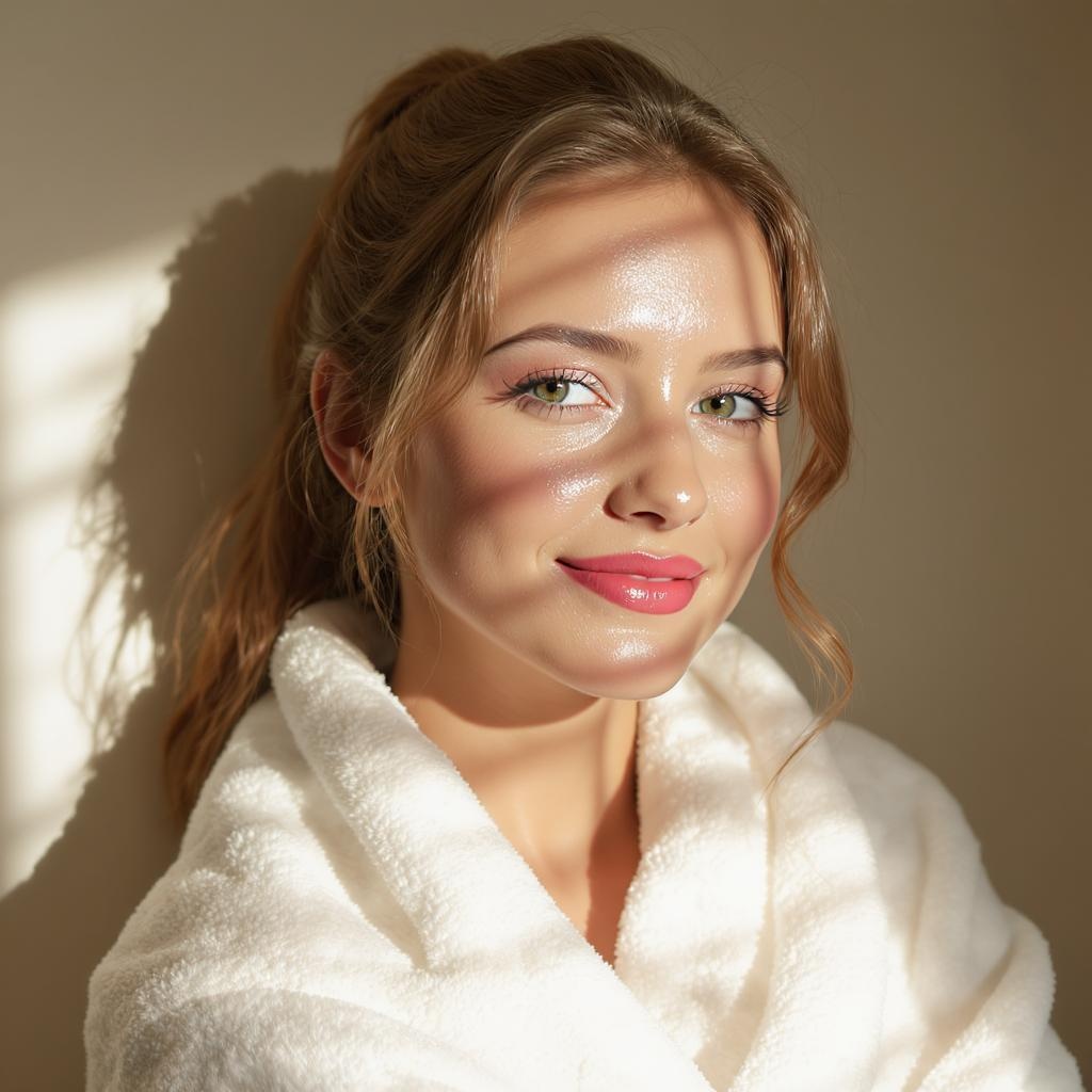 A portrait of a young woman with chestnut hair in a loose ponytail, her gentle smile enhancing her bright green eyes and soft pink lipstick. She is wrapped in a soft cream towel, with radiant, dewy skin illuminated by natural light. The background is subtly blurred, adding to the tranquil and intimate ambiance.