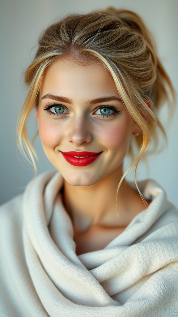 A portrait of a young woman with honey-blonde hair in a loosely tied ponytail, her gentle smile highlighting her sparkling green eyes and deep red lipstick. She is wrapped in a light, airy shawl over her shoulders, her skin radiant and luminous under the natural light. The background is softly blurred with pastel hues, enhancing the serene and intimate ambiance.