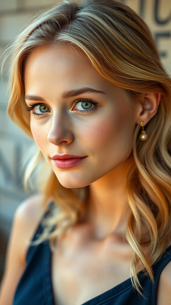 A portrait of a young woman with sun-kissed blonde wavy hair cascading around her shoulders and striking light hazel eyes. Her clear complexion is complemented by a gentle sprinkle of freckles dancing across her nose and cheeks. Her gaze is thoughtful as she looks towards the viewer, her expression serene and inviting. She wears subtle makeup, with an emphasis on her expressive eyes, and a single elegant, gold or shimmering pearl drop earring. She is dressed in a simple dark blue sleeveless top, set against a soft, natural backdrop that evokes a sense of an outdoor garden setting. The lighting is warm and natural, enhancing her features and adding to the tranquil ambiance.