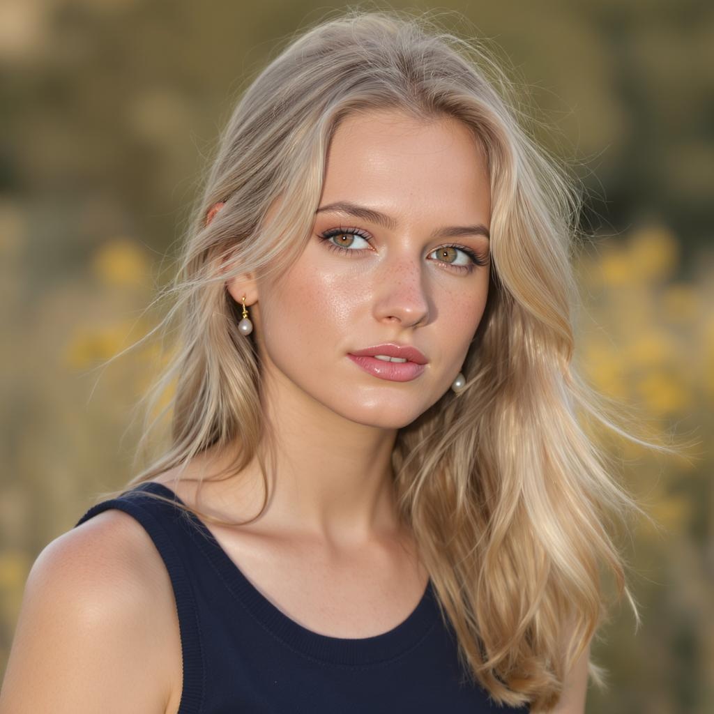 A portrait of a young woman with sun-kissed sandy blonde waves framing her face and luminous hazel eyes. Her complexion is clear, accentuated by a gentle dusting of freckles across her nose and cheeks. Her expression carries a thoughtful, introspective quality as she gazes towards the viewer. She sports minimal makeup that enhances her eyes, complemented by a delicate pair of gold or pearl drop earrings. She is dressed in a modest, sleeveless navy top, set against a soft, natural backdrop that hints at a tranquil outdoor environment. The lighting is mellow and natural, casting a serene glow on her features, enhancing the overall tranquil aura.