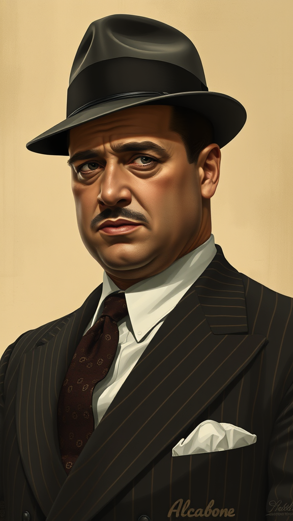 A portrait of Al Capone in his iconic pinstripe suit, intricately detailed with a realistic touch, featuring vintage sepia tones in a digital painting style. Inspired by the artistic influences of Greg Rutkowski, Alphonse Mucha, and Norman Rockwell, the image captures a timeless feel, suitable for trending displays on Artstation. The focus is on the classic elegance of the early 20th century, blending historical accuracy with artistic flair. The composition does not include explicit content, while emphasizing a finely crafted portrait with expressive details and a sophisticated ambiance.
