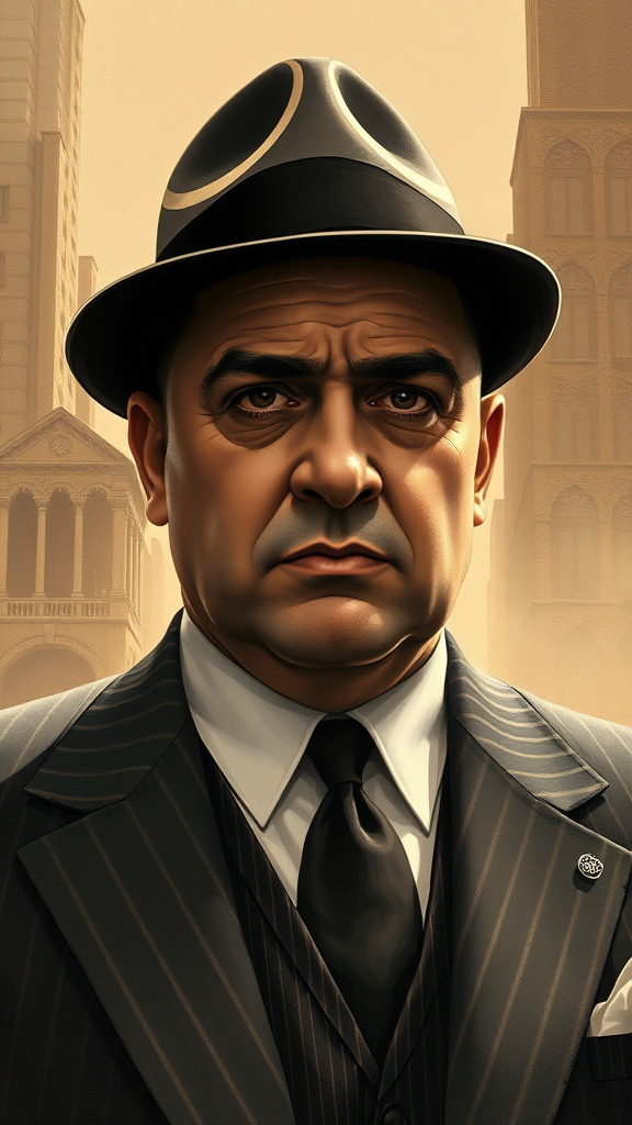 A portrait of Al Capone in his signature pinstripe suit, highly detailed, realistic rendering, vintage sepia tones, digital painting, trending on Artstation, art inspired by Greg Rutkowski, Alphonse Mucha, and Norman Rockwell, depicting a classic 1920s Chicago backdrop, emphasizing Capone's confident expression, with subtle elements of Art Deco style.