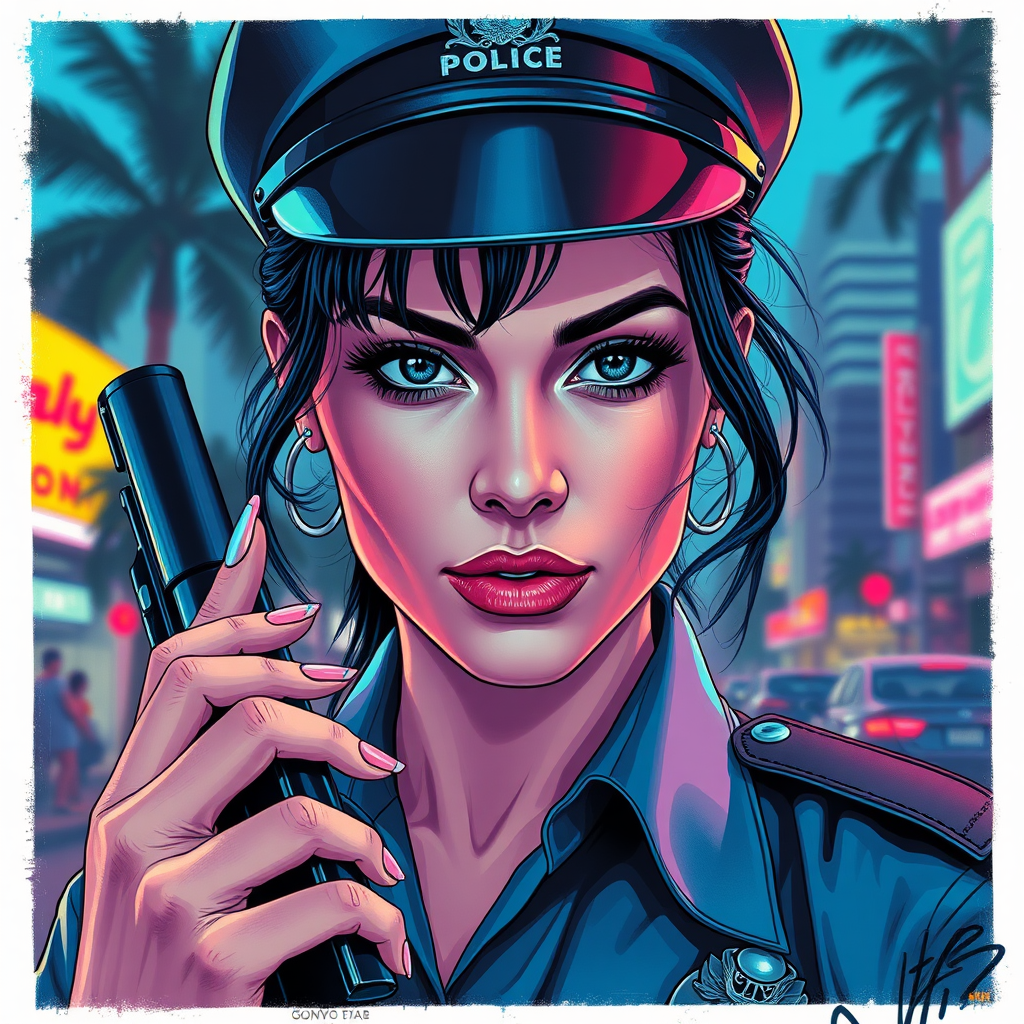 A portrait of an 80's Miami police woman, centered, intricate, featuring breathtaking beauty with precise lineart. This vibrant, cinematic depiction is inspired by the styles of Guy Denning and Sandra Chevrier. Rendered in 8k resolution and HDR, capturing the essence of a vice city ambiance. Despite its qualities, the artwork includes imperfections like jpeg artifacts, text errors, and missing fingers. There's a hint of bad anatomy, such as extra digits and poorly drawn hands. The composition is slightly cropped, and exhibits deformations that create a unique, distorted charm. Elements are intentionally fuzzy and disfigured, enhancing the overall retro aesthetic. Subtle watermarks and the suggestion of an artist's signature blend into the piece, adding to its complex narrative allure.