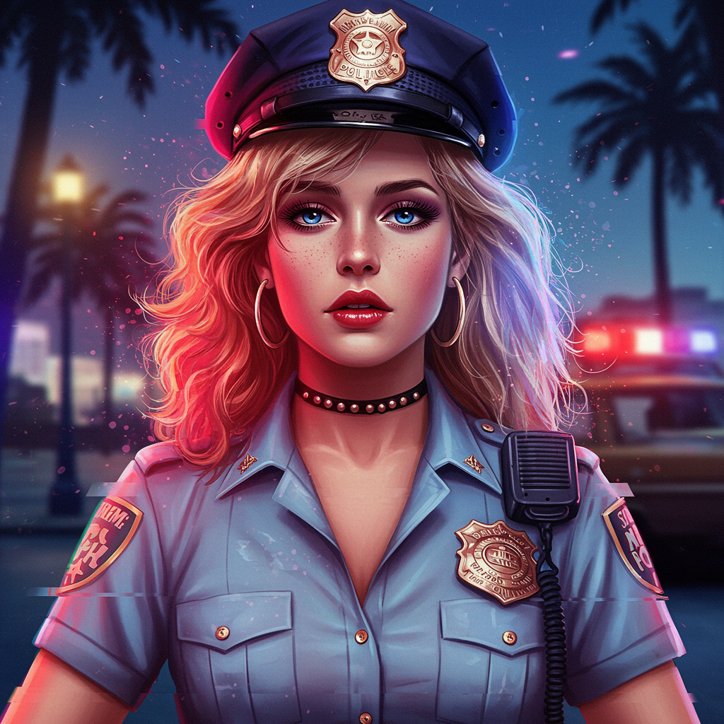 A portrait of an 80's Miami policewoman, centered and intricate, with highly detailed features and breathtaking beauty. The image showcases precise linework, vibrant colors, and a comprehensive cinematic style inspired by artists like Guy Denning and Sandra Chevrier, presented in 8k resolution with hdr effects. Influences from Vice City are subtly present, giving a nostalgic yet modern twist. Despite its detailed elegance, there are intentional errors that add character: text fragments, errors in anatomy like missing or extra digits, cropped elements, jpeg artifacts, and signatures. The portrayal includes artistic quirks such as poorly drawn hands and feet, disfigured or mutated features contributing to an abstract allure. The overall composition is slightly out of frame, with effects like tiling, fuzziness, or blurriness offering a unique perspective. Intentional flaws like watermarks and artist labels subtly integrate themselves, merging the boundary between finished artwork and process.