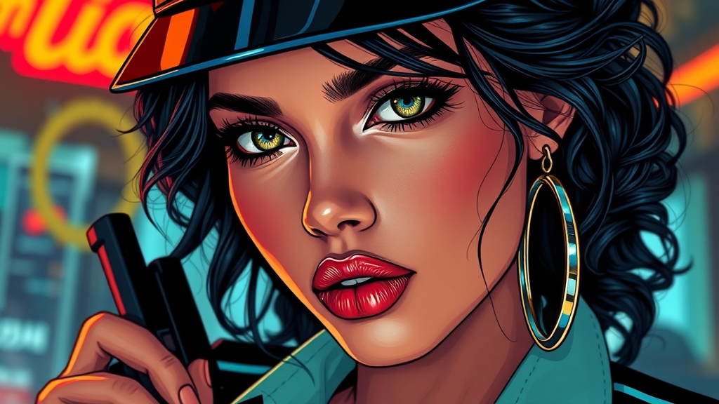 A portrait of an 80's Miami policewoman, centered, with intricate and highly detailed features, exuding breathtaking beauty. The artwork showcases precise line art, vibrant colors, and a comprehensive cinematic quality reminiscent of Guy Denning and Sandra Chevrier's styles, rendered in 8k HDR with a nostalgic Vice City low-res feel. The composition creatively incorporates elements like jpeg artifacts, signature, and occasional text or error markers, intentionally hinting at missing or extra digits, cropped areas, and elements of bad anatomy or disfigurement, conveying a sense of raw, imperfect artistry. The piece explores themes of beauty intertwined with flaws, resulting in a unique and evocative portrayal.