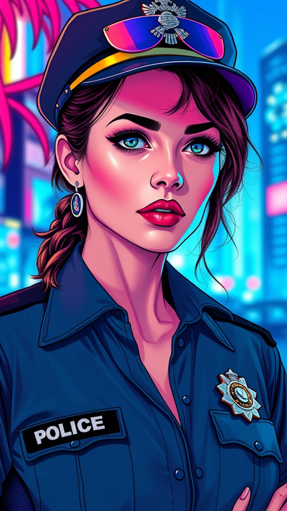 A portrait of an 80's police woman in Miami, capturing the iconic style of the era. She stands centered with a stunning, breathtaking beauty, rendered in intricate, highly detailed lineart. The vibrant colors evoke a comprehensive cinematic feel, reminiscent of Vice City, inspired by artists like Guy Denning and Sandra Chevrier. The artwork is envisioned in 8k resolution with hdr effects. Despite its beauty, the piece contains deliberate imperfections—text errors, missing fingers, or extra digits. It appears slightly cropped, with hints of jpeg artifacts and a subtle, almost hidden signature. Elements of bad anatomy are present, such as extra limbs, poorly drawn hands, and an out-of-frame composition. It's adorned with intentional flaws like tiling, and appears disfigured and deformed, creating a mutated, surreal vibe. The overall appearance becomes blurry and misshaped, adding a mutant, grotesque quality. Watermarks, artist names, and copyrights are subtly embedded within the image, enhancing the complex structure and beauty of this unique piece.