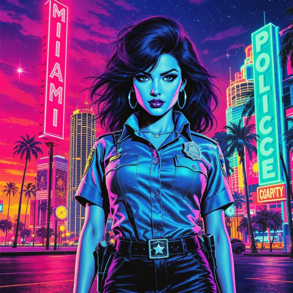 A portrait of an 80's police woman in Miami, centered with intricate and highly detailed features, showcasing breathtaking beauty and precise lineart. The composition is vibrant and resembles a comprehensive cinematic style inspired by Guy Denning and Sandra Chevrier, presented in 8k HDR. The setting reflects the vibrant yet nostalgic atmosphere of Vice City. Despite potential technical imperfections like text errors, missing or extra digits, cropped elements, JPEG artifacts, and bad anatomy, the art retains its core aesthetic. While the image may include details such as blurriness, fuzzy outlines, or watermark presence, the essence of a strong, beautiful police woman set in a vibrant 80's Miami remains intact.