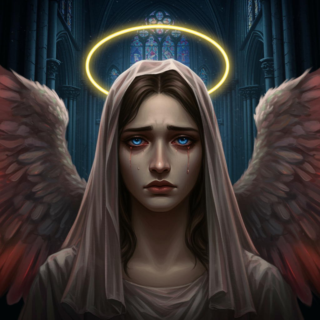 A portrait of an angel with a deeply sad expression, featuring a radiant halo of light above their head. Set against the backdrop of an ancient cathedral, the mood is enhanced by soft, ethereal lighting that gives a gentle neon glow. The angel has captivating blue eyes reminiscent of the style of French painter Alexandre Cabanel. The figure is draped in a delicate veil, adding an air of mystery and grace. While maintaining a realistic and painterly approach, the scene incorporates subtle hints of 3D elements for depth. The artwork focuses on elegance and emotional depth, avoiding exaggerated or distorted features, and maintains balance in anatomy and form.