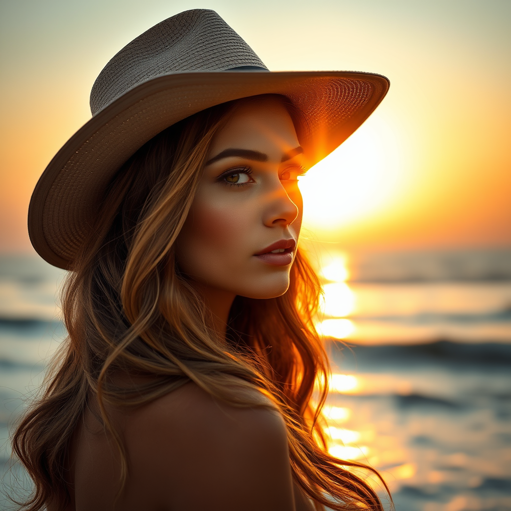 A portrait of an elegant woman, with cascading waves of long hair, adorned in a stylish taupe sunhat, set against the backdrop of a serene ocean at sunset. Her complexion is warmly illuminated by the golden hues of the sun, casting a coppery glow across her skin, with sun flares adding a touch of magic to the scene. The tranquil waves and dusky sky enhance the ethereal atmosphere, creating a harmonious blend of natural beauty and serene ambiance.