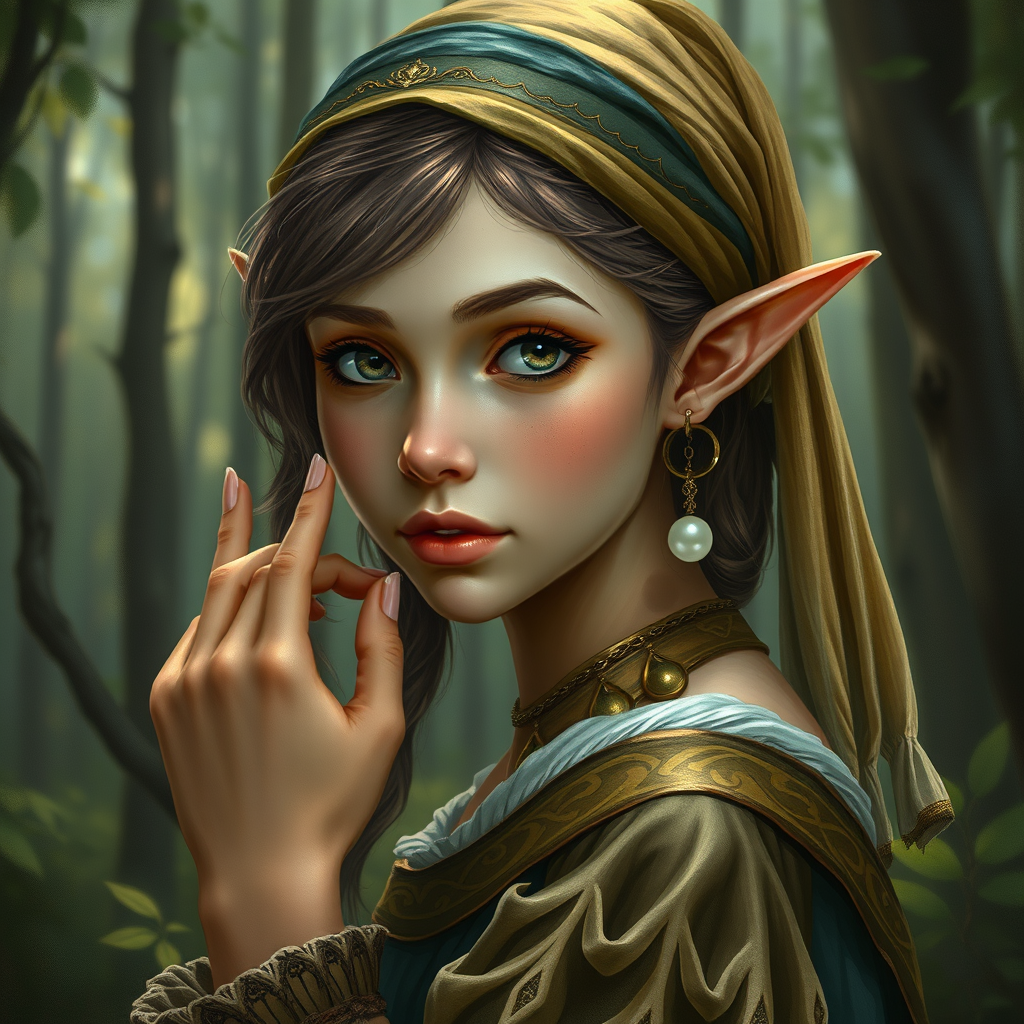 A portrait of an enchanting elf girl reminiscent of the "Girl with a Pearl Earring," set in a mystical forest. The digital art piece is a detailed illustration that captures the essence of fantasy, drawing inspiration from artists like Dan Mumford, Peter Mohrbacher, and Greg Rutkowski. The elf character is depicted with intricate details, in high definition and 4K quality, making it a standout piece on ArtStation. The artwork is free of any anomalies, focusing on perfect anatomy, beautifully drawn hands, and an ethereal atmosphere. The portrait conveys a sense of wonder and magic, with subtle creative modifications that enhance the overall concept while maintaining the core inspiration of a classic and fantasy blend.