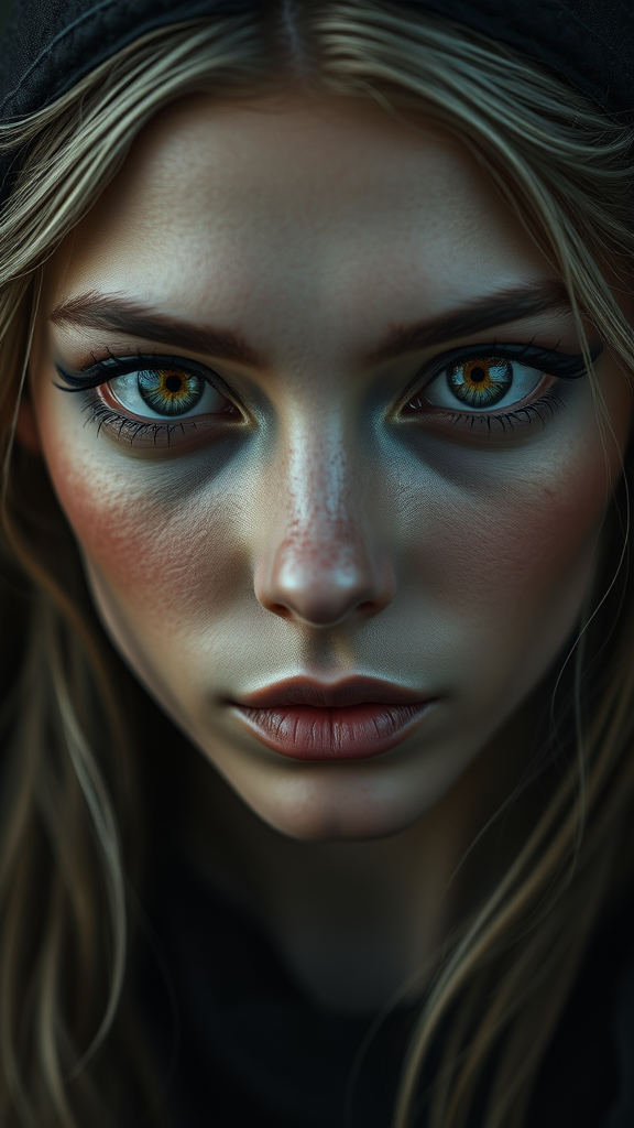 A portrait of an enchanting elven healer set against a deep black background, showcasing strikingly realistic reflective eyes with perfect irises, complemented by exquisite facial features. The portrayal is capturing femininity and allure in a style reminiscent of David Kassan and Ismail Inceoglu, with a hypermaximalist approach. The scene is brought to life with volumetric lighting and deep, vibrant colors, resulting in an award-winning, 8k, UHD, HDR masterpiece. The image avoids technical flaws like duplicated or disfigured elements, ensuring a seamless and lifelike representation without any distortions or low-resolution artifacts. The focus remains sharp and clean, with no distractions such as watermarks, logos, or text interruptions.