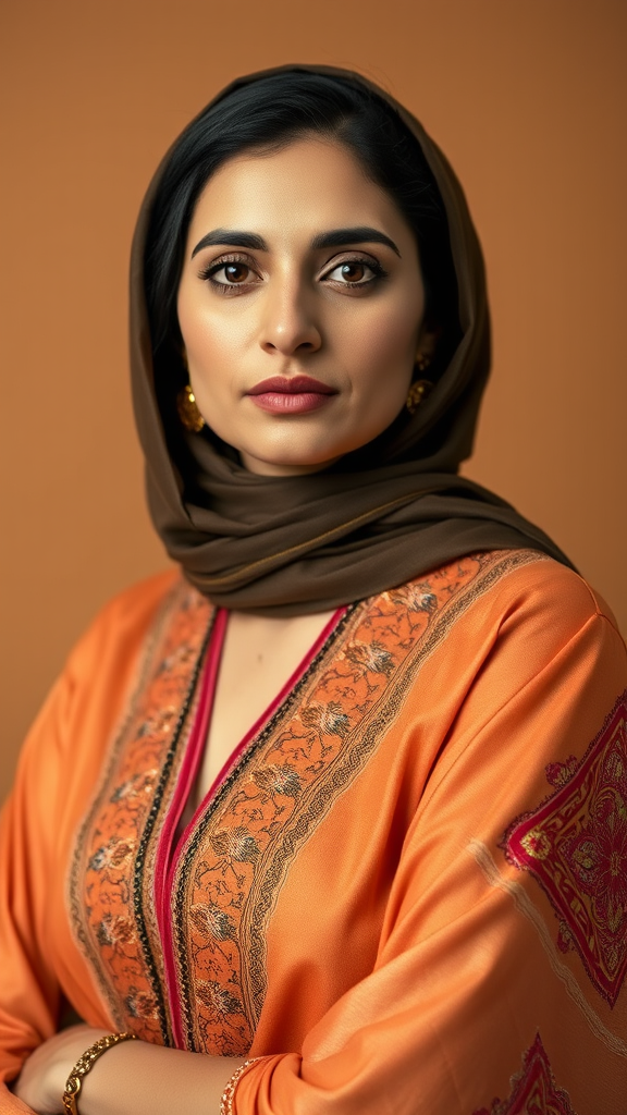A portrait of an everyday Arab woman in her early thirties, standing with poise and self-assuredness against a soft caramel backdrop, her eyes gleaming with quiet determination and her traditional yet contemporary attire subtly reflecting her vibrant cultural heritage.