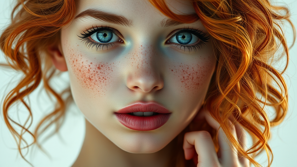 A portrait of an exceptionally beautiful 25-year-old woman with pale skin, captivating blue eyes, and scattered freckles across her cheeks. Her full lips are wide and inviting, framed by a cascade of messy, curly red hair. The style is inspired by graphic manhwa art, delivering an 8k high quality image that is UHD and HDR. The model is envisioned as Dark Sushi with a 2.5D effect. The focus is on maintaining symmetry and natural aesthetics, with a harmonious balance of her features, a graceful neck, and well-proportioned hands. The background is clear and sharp, free from distractions such as artifacts, logos, or text, allowing the viewer to fully appreciate the artistic portrayal.